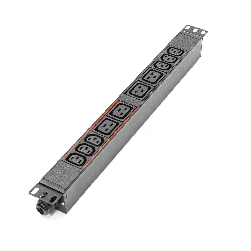 Блок розеток однофазный горизонтальный, 19", 6 розеток C13, 4 розетки C19, 63A, вход питания клеммный терминал, вход кабеля с двух сторон блока нагрузка по 32А на каждый вход