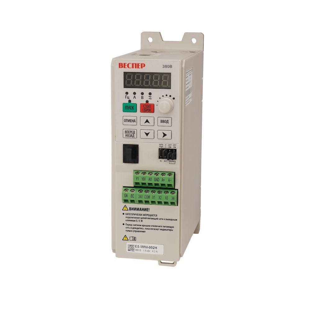 Частотный преобразователь Веспер E5-MINI-002Н 1,5 кВт 380В имеет пусковой момент 150% на частоте 1 Гц, ПИД-регулятор с индикацией реальной физической величины, встроенный сетевой протокол MODBUS (интерфейс RS-485) и встроенный фильтр ЭМС.