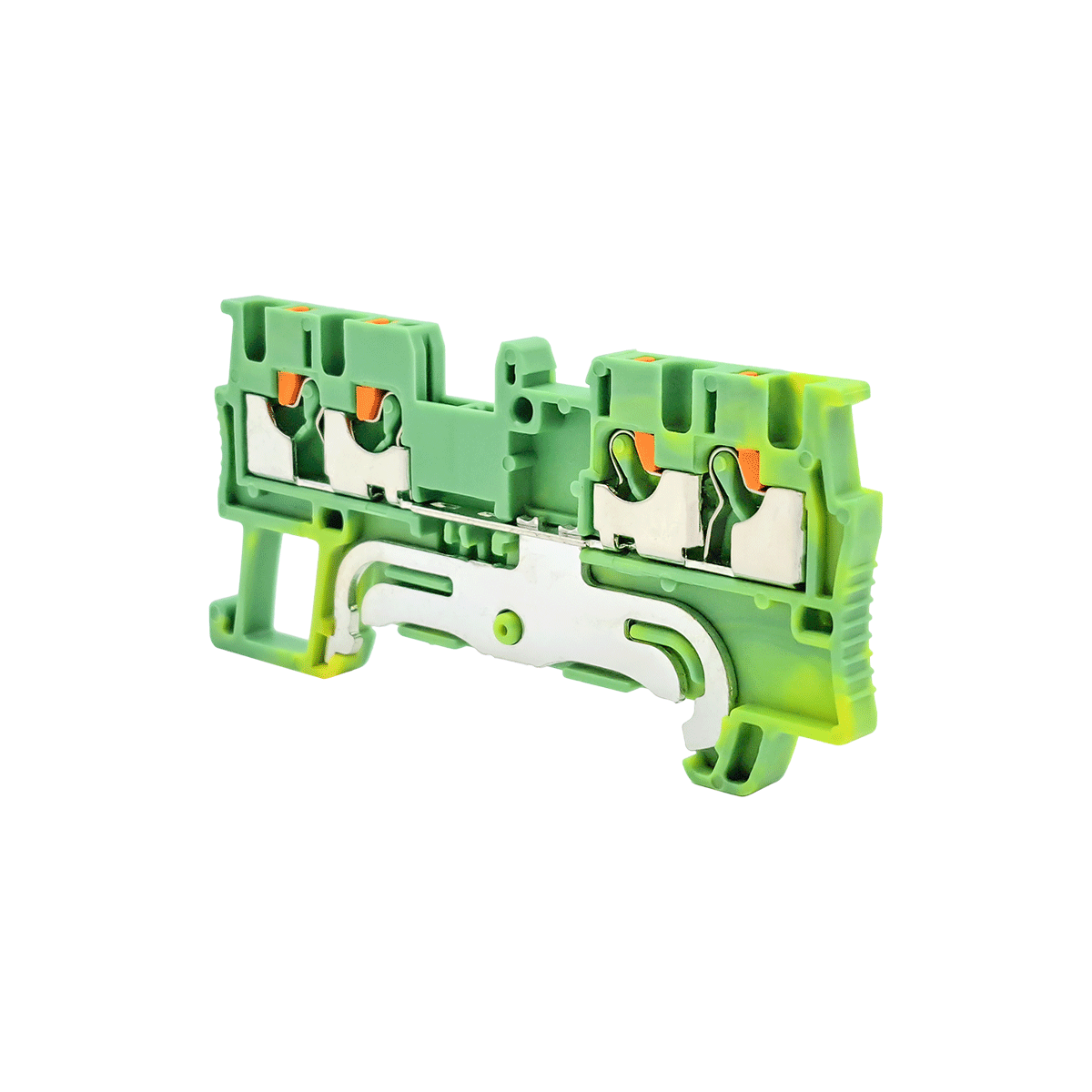 Заземляющие четырехпроводные push-in клеммы MTP-FO1.5PE применяются для подключения защитных заземляющих проводников. Клемма фиксируется на DIN-рейке простым защелкиванием без использования инструментов.