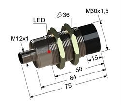 Индуктивный,М30,L-75мм,Sn 15мм,не заподлицо,NPN-NC,10-30VDC,разъем 4pinM12