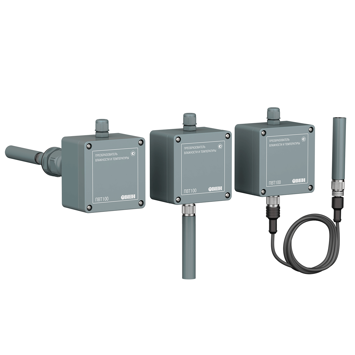 Модели ПВТ100-Н2 и ПВТ100-Н5 имеют соединительный кабель длиной 2,5 или 5 метров. Они применяются в специальных камерах или помещениях, где невозможно разместить базу датчика: в измеряемую среду помещается выносной зонд датчика. Датчик измеряет температуру от -40…+80 ⁰С и относительную влажность от 0...100 %RH. Для задач, в которых помимо аналогового 4…20 мА и цифрового выходного сигнала требуется выходной сигнал напряжение 0…10 В, рекомендуется использовать настенный промышленный датчик влажности и температуры ПВТ110.