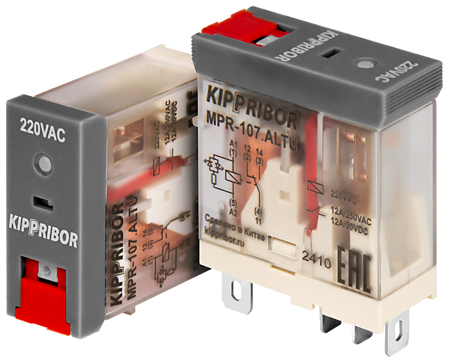 Реле серии MPR позволяют коммутировать как управляющие, так и силовые цепи. В корпусе компактного размера смонтированы до двух групп переключающих контактов, рассчитанных на токи до 12 А.