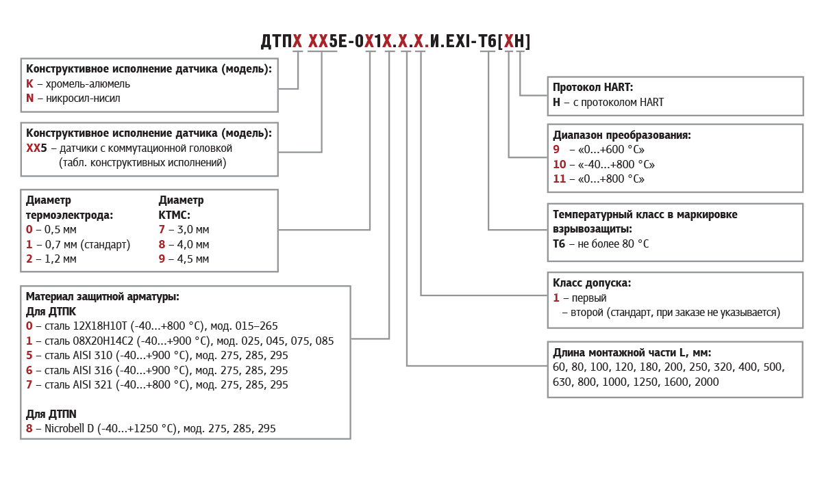 Это означает, что изготовлению и поставке подлежит термопара «хромель-алюмель», материал защитной арматуры – сталь 12Х18Н10Т с диапазоном измерения температуры: -200…+800 °С, с изолированным рабочим спаем, диаметром термоэлектрода 0,7 мм, с металлической коммутационной головкой, длиной монтажной части 120 мм, в корпусе модели 035, класс допуска 1, во взрывозащищенном исполнении (искробезопасная цепь 0Ex ia IIС Т6 Ga X), температурный класс Т6, диапазон преобразования температур: -40…+800 °С, с HART-протоколом.