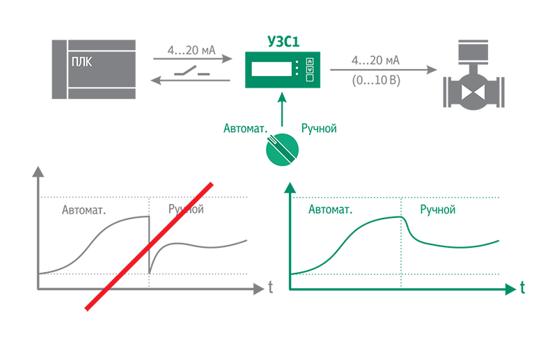 - Переключение «автомат/ручной» без скачков (безударный переход)